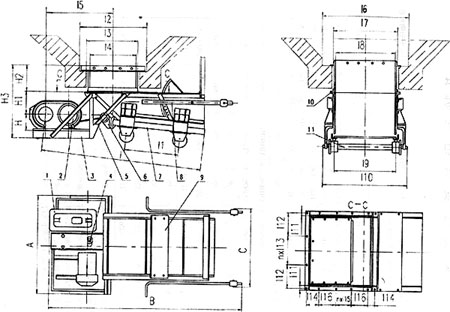 1、減速機(jī) 2、電動機(jī) 3、傳動平臺 4、聯(lián)軸器 5、H形架 6、連桿 7、給煤槽 8、閘門 9、機(jī)架 10、漏斗 11、托輥