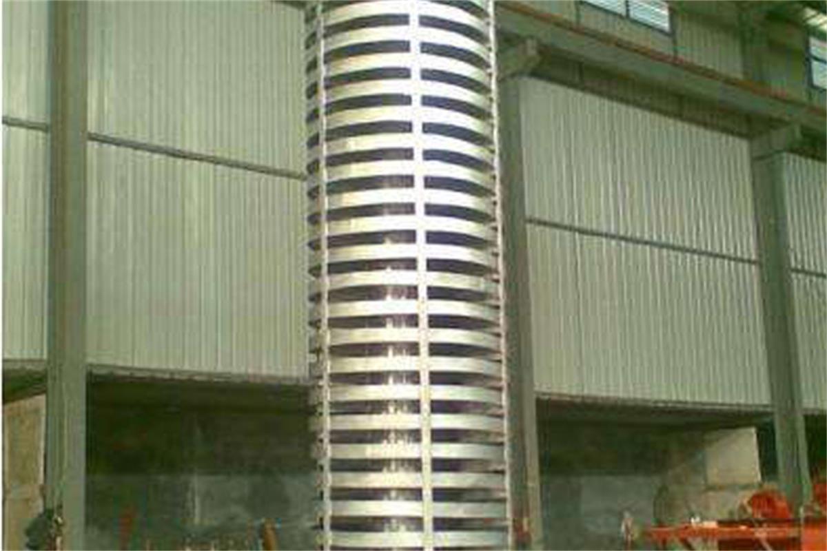 垂直振動輸送機是通過激振器強迫振動,使輸送塔作沿垂直方向的直線振動和繞鉛垂中心軸的扭動振動,兩個振動的合成,使物料朝        螺旋運動的方向斜拋,形成了物料沿螺旋槽向上的輸送過程。垂直振動輸送機是由提升槽、振動電機、減振系統和底座等組成。垂直振動輸送機分開槽式、封閉式兩種結構。